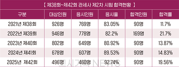 참고로, 지난 4년간(2021~2024년) 합격률을 살펴보면 ▲1차 27.8% →26.1%→24.8%→25.42% ▲2차 11.7%→21.7%→13.9%→ 14.83%의 추이를 보였다.