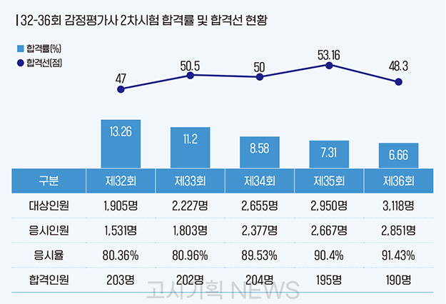 이번 2차시험의 총 대상자는 3천118명으로 이중 267명이 결시하고 2천851명이 응시했다. 응시율은 91.43%다. 합격자는 190명이며 응시자 수 대비 6.66%에 달한다. 평균 합격선은 48.33점이다. 이는 지난해 합격선인 53.16점보다 하락했다.