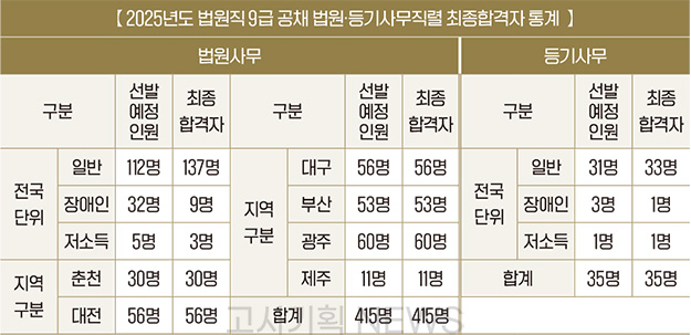 2025년 법원직 9급 공개경쟁채용시험 법원·등기사무직렬 최종합격자가 공고됐다.