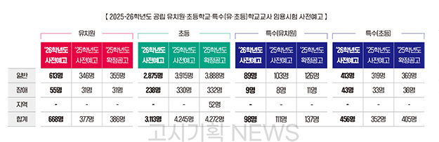 각 시·도 교육청은 2026학년도 공립 유치원·초등학교·특수학교(유치원·초등)교사 임용후보자 선정경쟁시험 사전예고를 마쳤다.