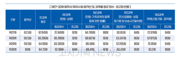 전 과목 평균점수는 64.73점이었으며, 과목별로는 ▲제1과목(헌법, 상법) 62.89점 ▲제2과목(민법, 가족관계의 등록 등에 관한 법률) 69.41점 ▲제3과목(민사집행법, 상업등기법 및 비송사건절차법) 63.43점 ▲제4과목(부동산등기법, 공탁법) 63.20점의 평균을 기록했다.