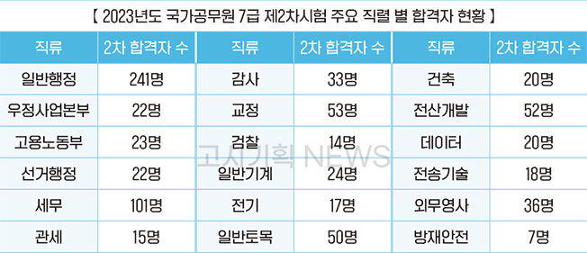 그 외 주요 직렬 별 합격자를 살펴보면 ▲일반행정 241명 ▲세무 101명 ▲관세 15명 ▲교정 53명 ▲일반기계 24명 ▲일반토목 50명 ▲전산개발 52명(이상 일반 기준) 등이 합격자 명단에 올랐다.